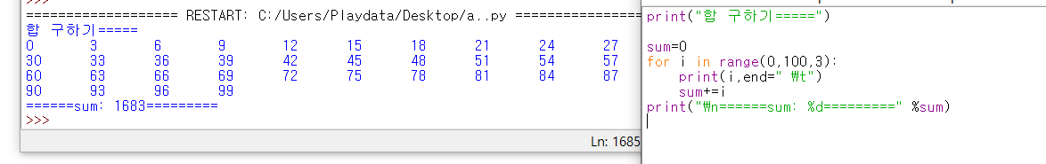 sum+=i가 왼쪽으로 나오면 3725가 나온다. 50~100까지의 합이 출력됨 if문보다 들여쓰기가 되어야 조건에 해당하는 값만 설정됨